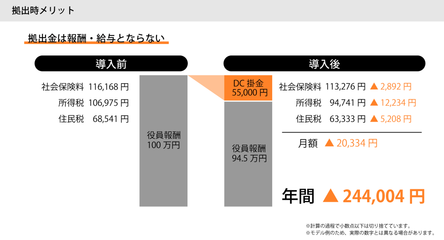 下図Aのように月額給与が100万円の役員の方を例にとりますと、月額の掛金額の上限は5万5千円なので、この5万5千円が給与額面から全額控除され、この役員の方の場合94万5千円が額面給与となります。その結果として、社会保険料、所得税、住民税が減り、節税効果が出てきます。下図のケースでしたら5万5千円の掛金で年間約24万円の節税効果が出てくる想定となります。