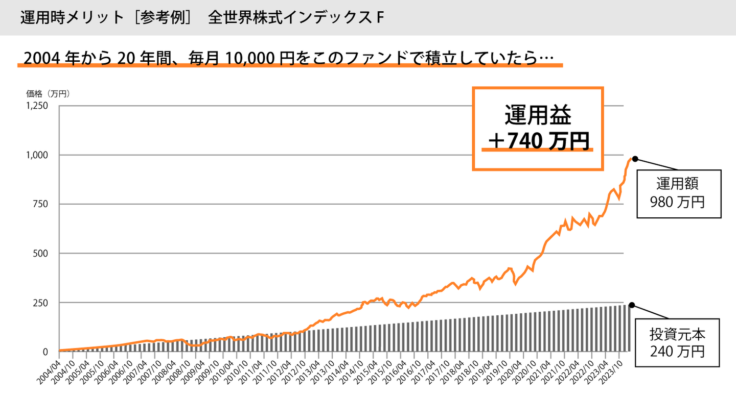 下図Cのパターンでは2004年から1万円ずつ全世界株式インデックスという投資信託にて掛け金を拠出したパターンを載せております。240万円の掛金(元本)に対して、運用結果は980万円、実に740万円のプラスとなりました。この740万円、通常の証券口座でしたら約20%の税金が発生してしまいますが(この場合は約148万円の税金)、企業型確定拠出年金で運用した場合の利益は全額非課税ですので、この740万円の利益は非課税で受け取ることができます。